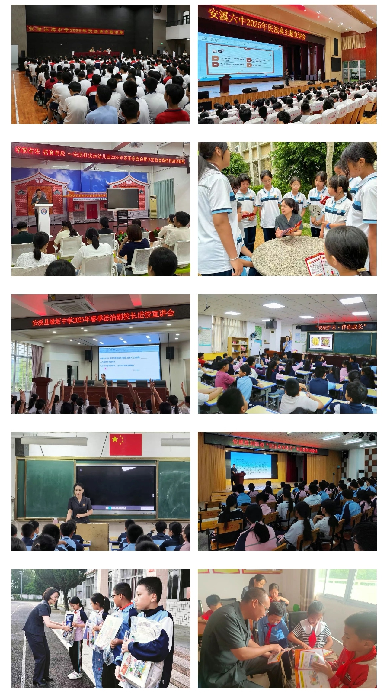 院领导、民一庭、生态庭、法警队、凤城法庭、湖头法庭、官桥法庭、感德法庭干警及各法治副校长分别前往辖区学校,开展“民法典宣传月”专题普法宣传,通过开展专题法治讲座、播放法治微电影、发放爱心礼包等形式,让同学们深入了解民法典的内涵和意义,提升同学们的法治思维和素养,引导学生进一步增强法律敬畏之心、法律意识和自我保护能力,以法治护航未成年人健康成长。